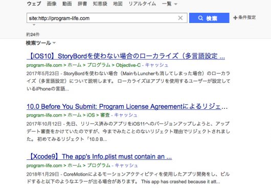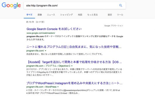 何件か記事が表示されているので私のサイトはインデックスされているということがわかります。