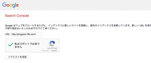 Google Search Consoleにアクセスしたら、自分のサイトやブログのURLを記入し、ロボットではありませんのチェックボックスにチェックをいれて、リクエスト送信します。