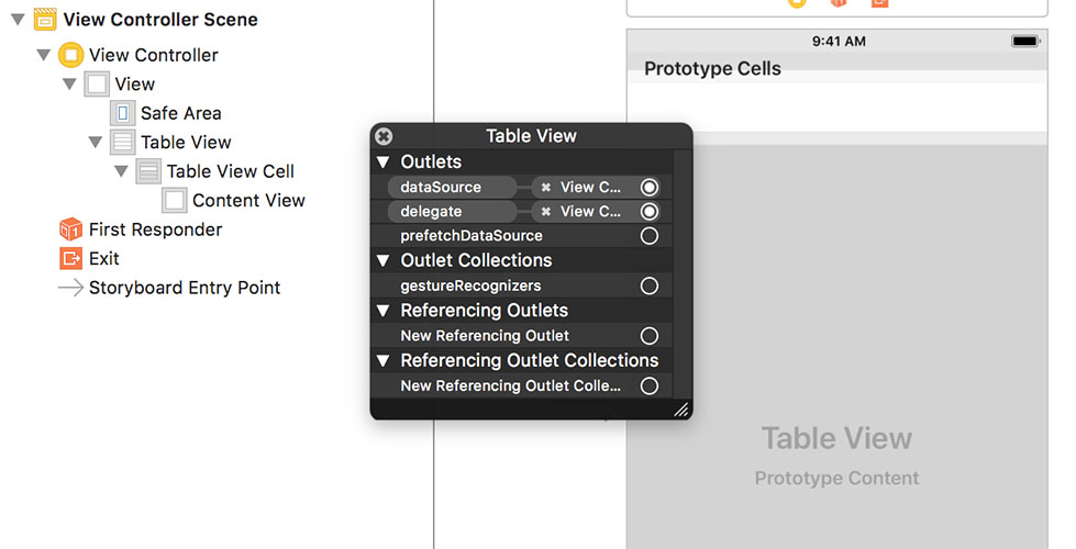 UITableViewを実装したいStoryboardにTableView、TableViewCellを配置し、TableViewのOutletsのdataSourceとdelegateを、TableViewを実装させるViewControllerにセットします。